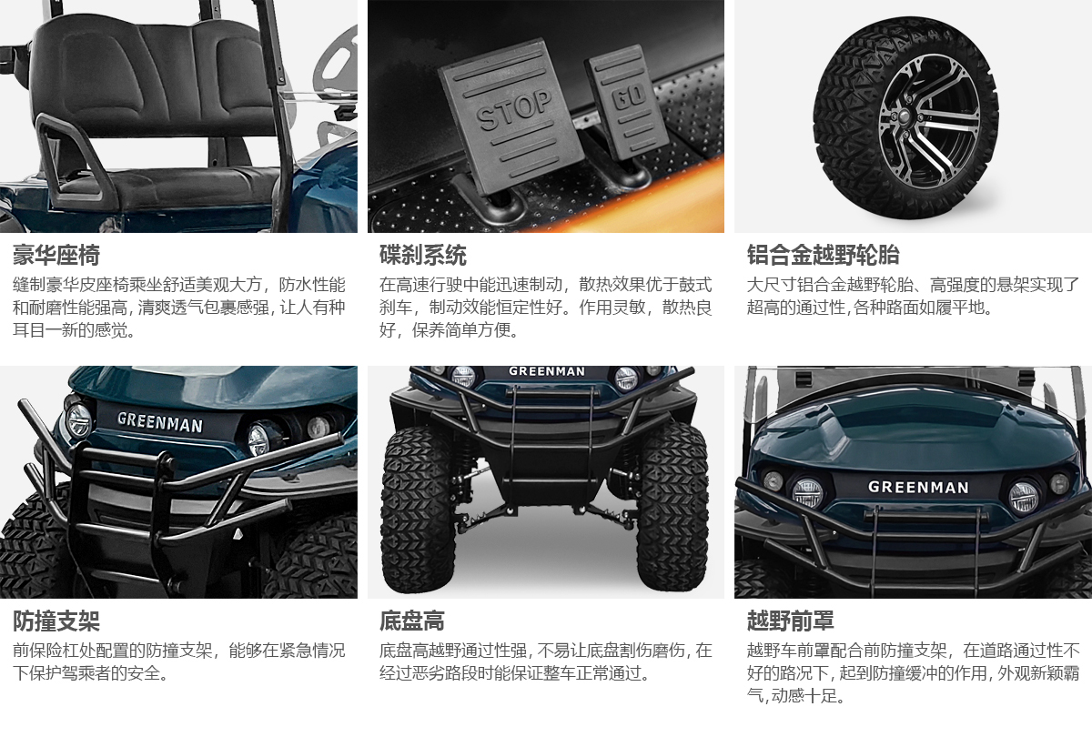 配备大功率电机和大容量电池,采用铝合金大尺寸越野轮胎, 四轮液压碟刹+电子驻车。车辆底盘高、动力足、安全性高,具备非同一般的驾乘感。 广泛应用于高尔夫社区、郊野、休闲度假酒店、大型农场工作。
